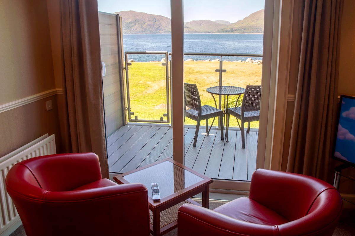 The patio doors open onto a private glass-fronted decking with a table and chairs, where you can enjoy sensational panoramic views over Loch Linnhe.